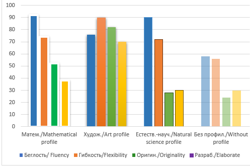 Исходя из положения о том, что креативность рассматривается как фактор одаренности в системе личностных способностей одаренных школьников (Дружинин, 2008), мы провели исследование психологических особенностей креативных способностей у школьников с различным профилем обучения. В исследовании приняли участие 140 школьников, обучающихся 8-х классов московских школ, т. к. именно на этом этапе образования существует максимальный потенциал в развитии их одаренности (Бурцева, 2022). В исследовании участвовали школьники с высокой академической успеваемостью, обучающиеся в классах с математическим, естественно-научным и художественным профилем обучения, а также в классах без специального профиля обучения. В целях изучения особенностей креативности использовалась методика, направленная на оценку творческого мышления (Туник, 1998). Творческое мышление считается ключевым когнитивным процессом и компонентом креативности, служащим надежным показателем креативных способностей человека. Ключевые показатели творческого мышления включают способность генерировать множество идей (беглость), подходить к проблемам с различных точек зрения (гибкость), находить новые решения (оригинальность) и давать подробные или продуманные ответы (разработанность). Наличие этих качеств в мышлении человека и его усилиях по решению проблем напрямую отражает его общую креативность.