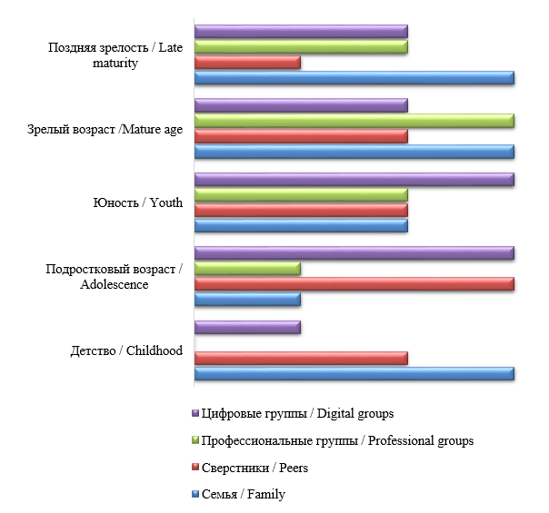 РГ «Цифровые/виртуальные группы»: появляется в подростковом возрасте, резко растет, демонстрирует высокий уровень значимости на протяжении всей дальнейшей жизни с небольшими колебаниями.