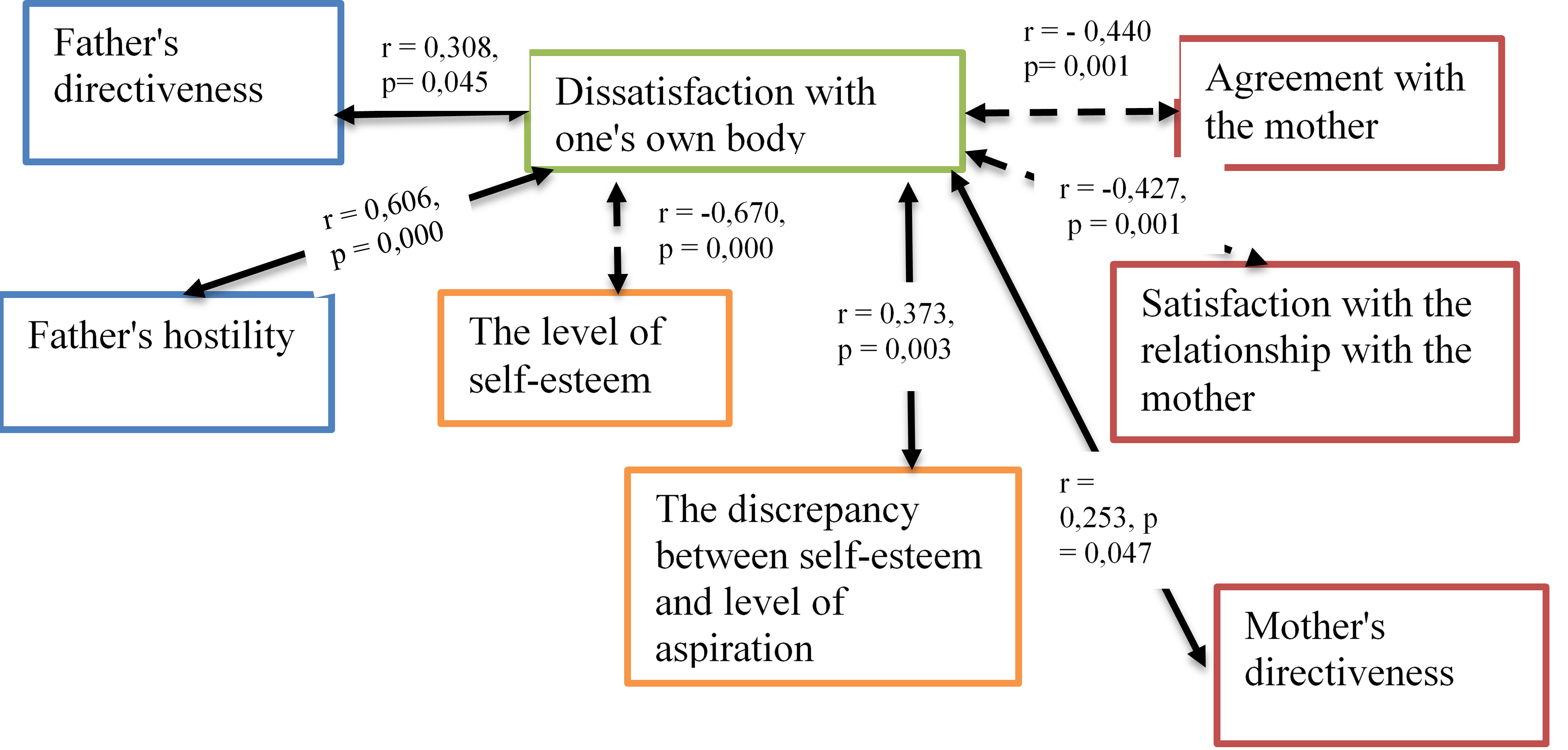 - враждебность со стороны отца и директивность обоих родителей коррелируют с неудовлетворенностью собственным телом у девушек. Дочери более требовательных отцов оценивают свое тело как менее привлекательное, красивое;