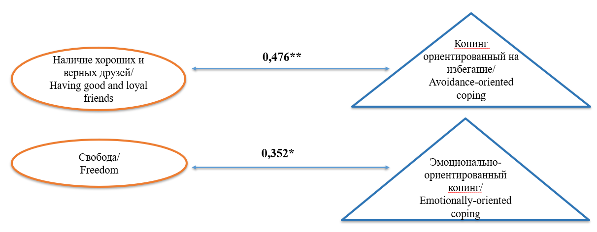 Рис. 2. Связь доминирующих предпочитаемых ценностей и адаптивных копинг-стратегий у старших подростков