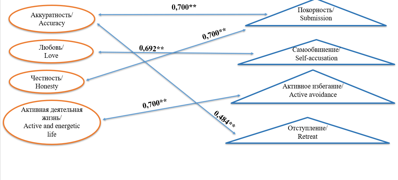 Обнаружены следующие достоверные связи ценностных ориентаций и неадаптивных копинг-стратегий старших подростков: «покорность» связана с предпочтением ценностей «аккуратность» (φ = 0,700; р < 0,01), «честность» (φ = 0,700; р < 0,01); «самообвинение» связано с предпочтением ценности «любовь» (φ = 0,692; р < 0,01); «активное избегание» связано с предпочтением ценности «активная деятельная жизнь» (φ = 0,700; р < 0,01); «отступление» связано с предпочтением ценности «аккуратность» (φ = 0,484; р < 0,01). Старшие подростки, для которых предпочитаемой ценностью является «аккуратность», в основном используют стратегию «покорность». А подростки, для которых ценность «любовь» является доминирующей, склонны применять стратегию совладания «самообвинение». Подростки, предпочитающие ценность «активная деятельная жизнь», в стрессовой ситуации используют стратегию «активное избегание», а подростки, для которых доминирующей ценностью является «честность», чаще используют стратегию «покорность». Подростки, для которых ценность «аккуратность» является предпочитаемой, в основном прибегают к применению стратегиb «отступление» (рис. 3).