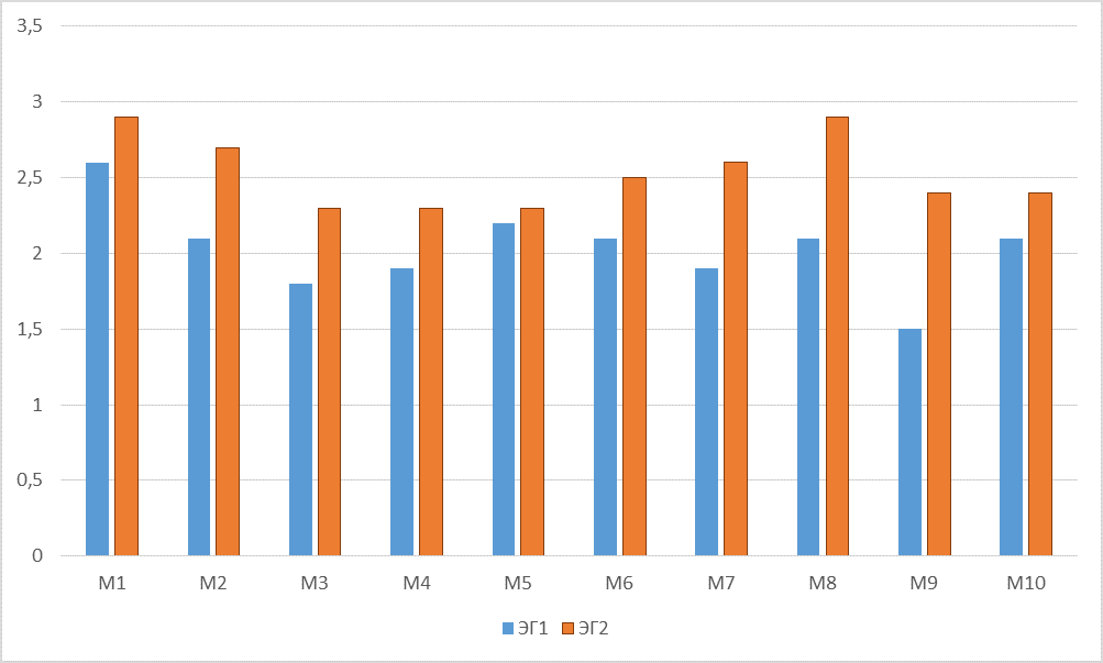 Среднее значение по каждой методике в ЭГ2 выше, чем в ЭГ1. Наиболее сильный разрыв (разница 0,9—0,7) наблюдается между показателями: