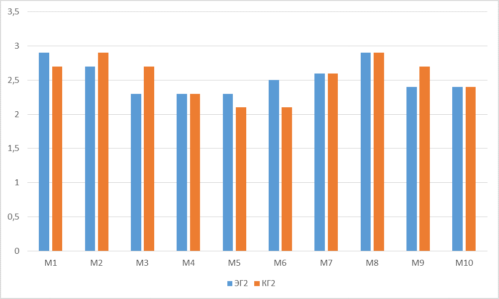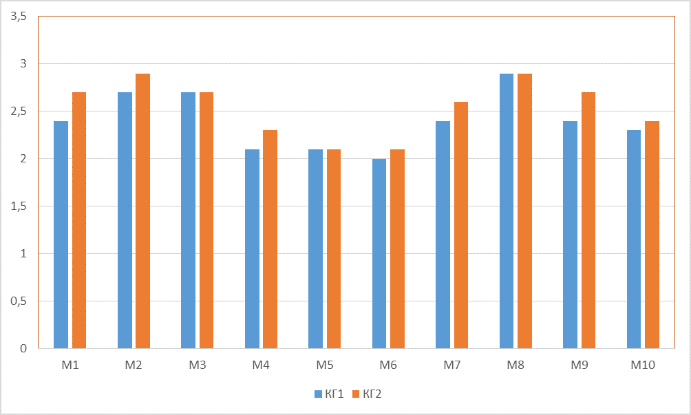 Среднее значение по каждой методике в КГ2 выше, чем в КГ1, или равно ему. Наиболее сильный разрыв (разница 0,3—0,2) наблюдается между показателями: