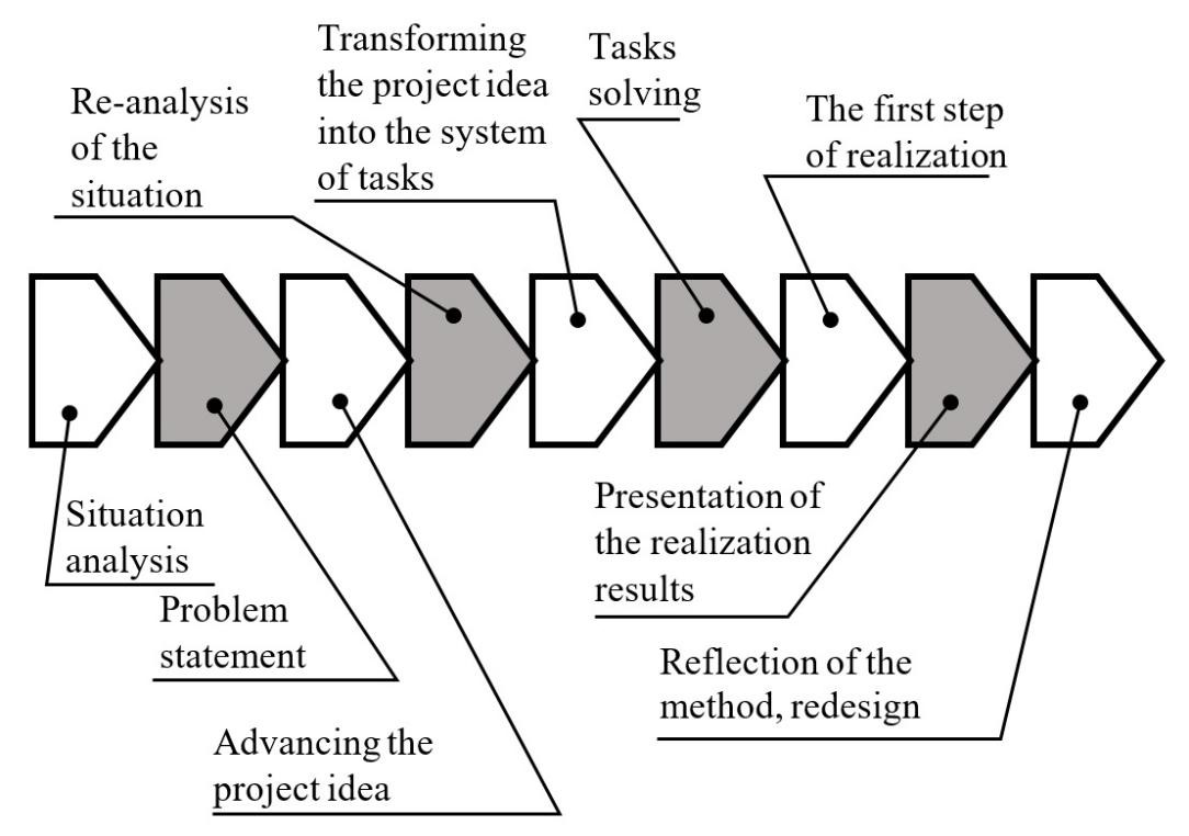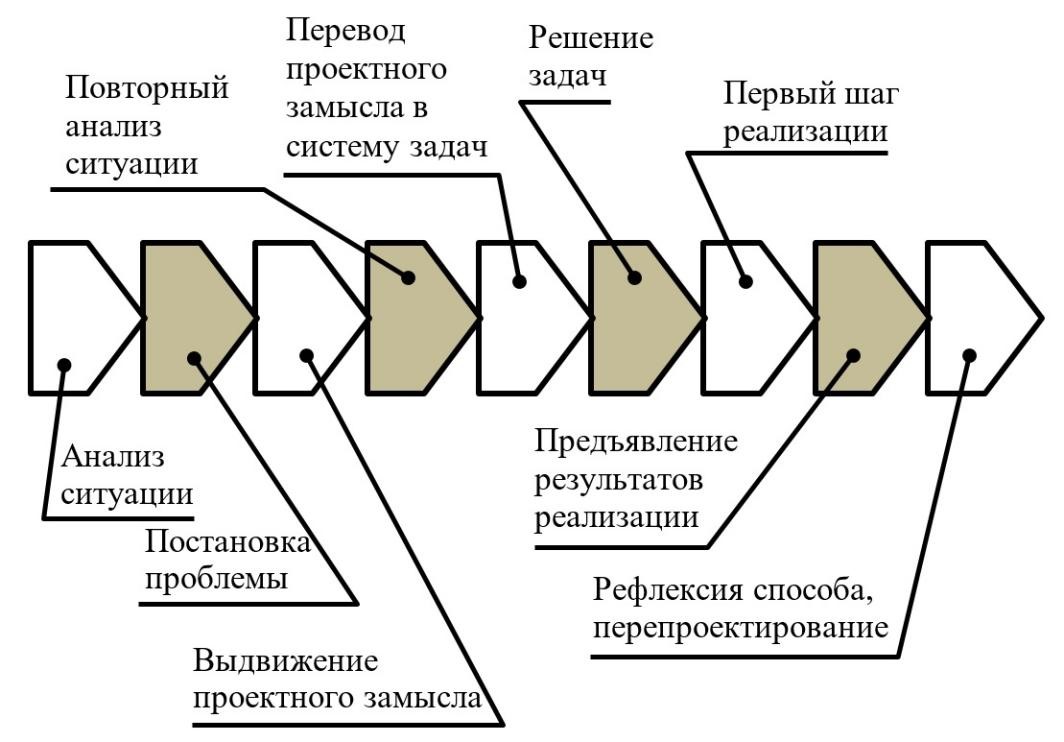 Проектная деятельность представляет собой последовательность этапов, изображенных на рис. 2 (Громыко Н.В., 2020). Для осуществления каждого из этих этапов требуются определенные способности мышления, понимания, воображения, рефлексии; данные способности и обеспечивают появление проектного мышления. Поскольку предполагается, что эти способности будут отчасти актуализироваться, отчасти зарождаться в ходе игры, игра требует: