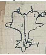 Это представляет собою (неразб.)… в Ташкенте или Тифлисе… животное, которое колет… скотина… Это его голова (1), это его руки (2), это его все части, только почему-то его разрезали пополам… это его две руки, а это его глаза (1), их только представляешь себе, это его средняя часть (3), это его конец. А это вместе с ним летали какие-то мелкие части во время… вот на что они похожи… это все равно, где красное и черное, одинаково? Сейчас Вам скажу! Это впечатление! … Это как то насекомое (4). Они очень похожи одна на другую. Почему вы думали, что это насекомое? Они очень маленькие и они двигаются13… |