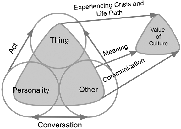 Внутренний ли это диалог отдельного человека или беседа в семье, в сообществе, на уровне государства или человечества — в любом случае разговор заходит в область философии, этики и морали (рис. 9, 10). Теперь забота о совместности с Другим весомо конкурирует с персональными интересами и приоритет может быть отдан тому или другому решению только в результате тщательного взвешивания ощущений, факторов и аргументов (Никольская, 2020, с. 113; Василюк, 2010). Так «поступок» (Бахтин, 2003) становится выразителем этого совместно разделенного, творчески-экзистенциального смысла и формирует жизненный путь личности (рис. 9).