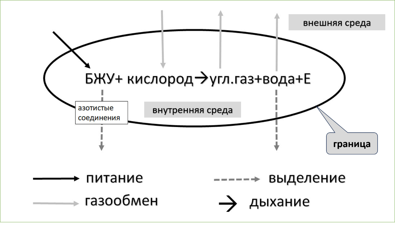 Fig. 1. The diagram illustrating the relationship between the main vegetative processes in the body. In it, for the first time, students encounter the boundary of the body, which separates the internal content where respiration takes place from other processes that occur at the boundary