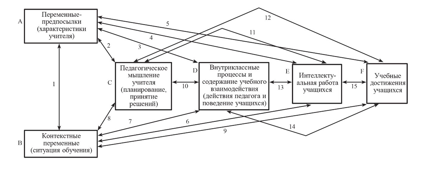 Теоретическое описание деятельности педагога включало 6 основных категорий (блоков) переменных и предполагало наличие 15 двусторонних взаимосвязей между ними. Каждый блок мог рассматриваться исследователем в качестве независимой переменной (или набора переменных), а исследование взаимосвязи между этими переменными позволяло изучить наличие между ними тех или иных корреляционных отношений. Таким образом, разработанная Н. Гейджем методология позволяла искать ответы на широкий спектр исследовательских вопросов, обеспечивая при этом высокий уровень академических требований (Gage, 1963). Важно также и то, что разработанная теоретическая модель была принципиально эклектична и не связана с той или иной конкретной теорией или концепцией, что позволяло ее использовать исследователям, придерживающимся самых разных научных взглядов.