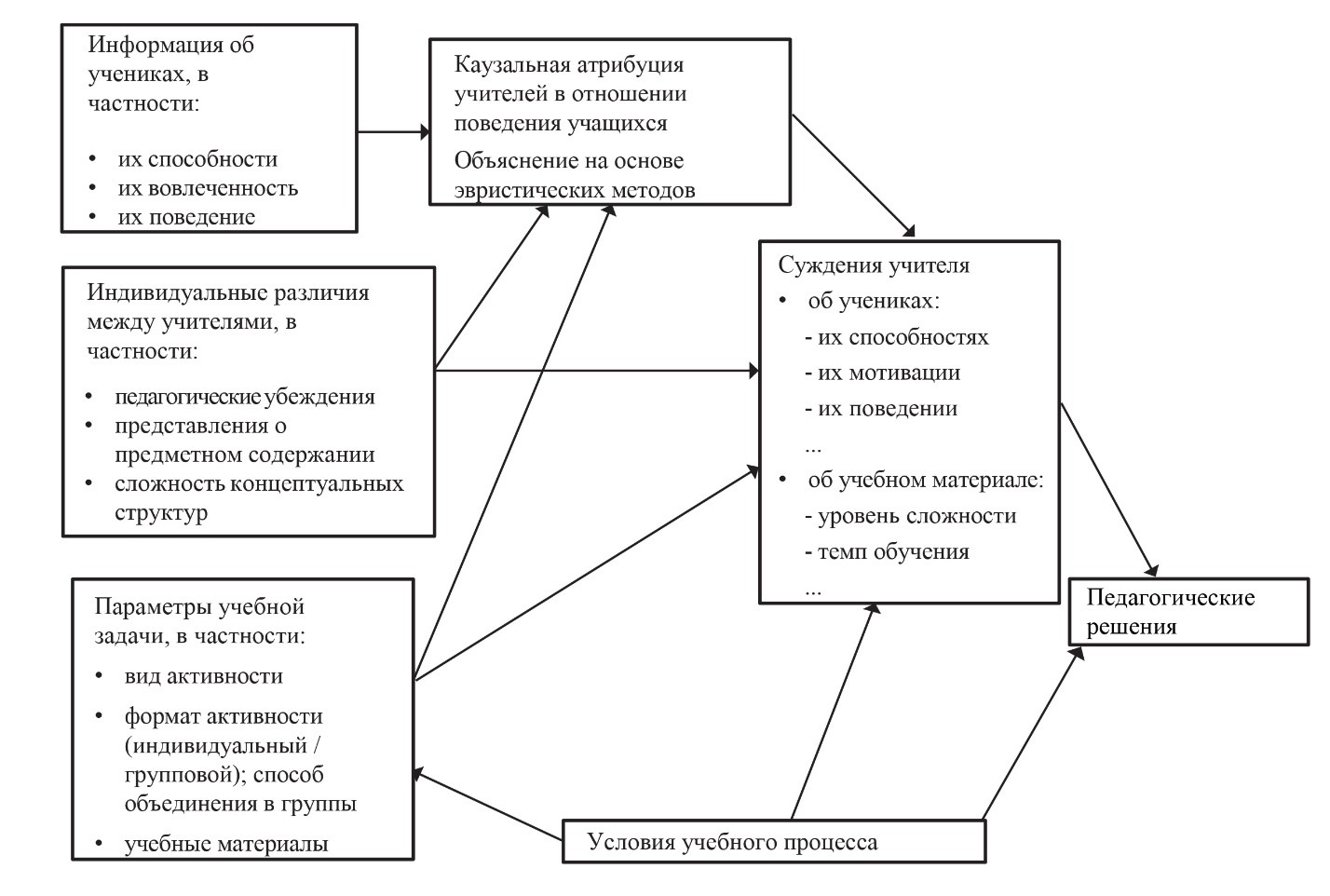 Решения, принимаемые учителем, часто опираются на сформулированные им суждения, которые, в свою очередь, определяются использованием тех или иных эвристик, приписывающих причины различным факторам, влияющим на обучение и поведение учащихся. В основе такого приписывания лежит процесс категоризирования, относящий учащегося к той или иной группе на основе ряда признаков и информации, обнаруженной учителем. Влияние этих факторов на принимаемые учителем решения описано в модели, разработанной Р. Шавельзоном и П. Стерн (Shavelson, Stern, 1981), представленной на рис. 2.