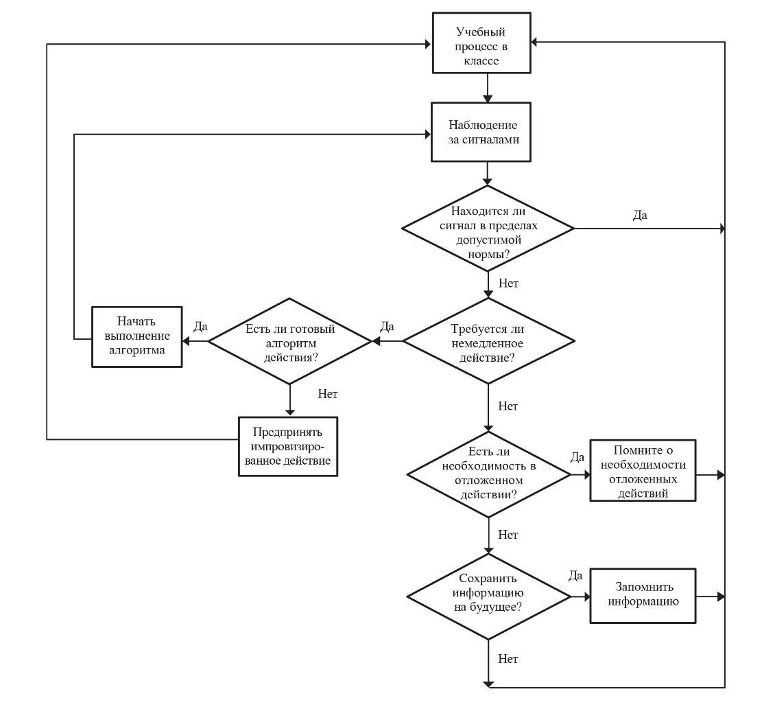 По мнению большинства исследователей, чьи работы были опубликованы в конце 70-х — начале 80-х годов XX века (Peterson, Clark, 1978; Shavelson, 1983; Joyce, 1978), деятельность учителя с точки зрения принимаемых им решений в ходе урока может быть схематично представлена в основном как следование выработанным ранее рутинизированным формам действий, соответствующим скриптам (сценариям) поведения в типовых педагогических ситуациях. Общая логика и последовательность организуемых при этом событий обычно вытекает из действий, ранее продуманных в плане урока. При этом действия учителя сопровождаются, как правило, автоматизированным мониторингом и контролем того, нет ли каких-либо признаков существенного отклонения урока от намеченного сценария. При обнаружении таких признаков, свидетельствующих о несущественном отклонении от намеченного плана (например, в процессе дискуссии несколько учеников вскакивают со своих мест), учитель обычно пытается понять, требует ли это каких-то немедленных действий с его стороны и есть ли у него в наличии (в его предыдущем опыте) некоторые способы рутинного реагирования на такие события. При необходимости таких действий и при наличии в опыте подходящих автоматизированных способов ответа на возникающую проблему учитель обычно спонтанно их применяет и возвращается к исходному сценарию проведения урока. В случае отсутствия необходимости немедленного реагирования на обнаруженную проблему или более существенного характера проблемы учитель может отложить запланированные действия до определенного момента, в том числе вернуться к ним на следующих уроках.