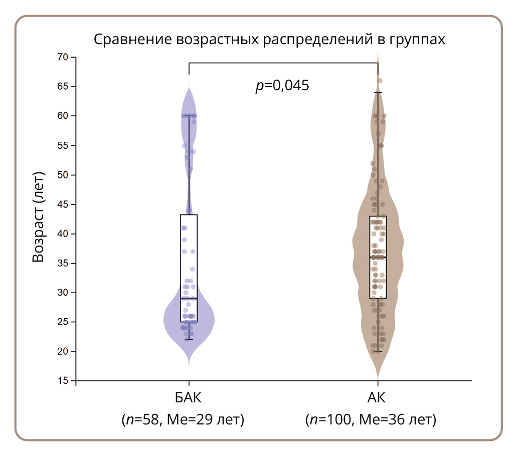 При этом в контрольной группе (БАК) у 16 (27,6%) человек отмечались переломы в анамнезе, у 42 (72,4%) человек переломов не было. У всех здоровых участников имеются указания на травмирующий механический фактор перелома. Тем не менее группы БАК и АК по данному показателю статистически значимых различий в частоте переломов не имели (χ2=0,205, p=0,651).