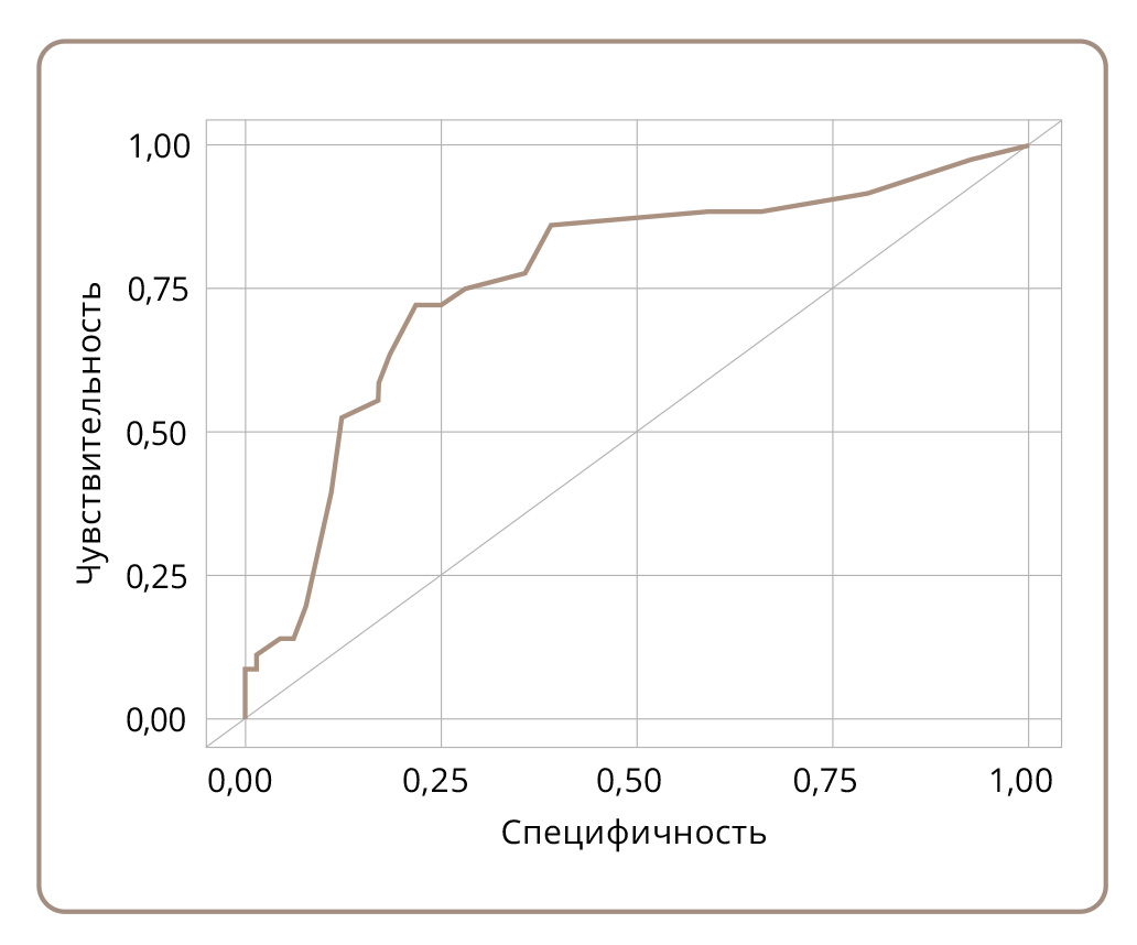 Данные исследования были закодированы, организованы в таблицы и проанализированы статистически с использованием программного обеспечения StatTech версии 3.1.10. Количественные параметры были проверены на соответствие нормальному распределению с помощью критерия Шапиро–Уилка. Если данные имели нормальное распределение, то они описывались средними (M) и стандартными (SD) отклонениями, а также границами 95% доверительного интервала (95% ДИ). В случае отсутствия нормального распределения количественные данные были представлены медианой (Me) и нижним и верхним квартилями (Q1–Q3). Категориальные данные выражены в абсолютных значениях и процентных долях. Сравнение двух групп по количественному параметру с нормальным распределением и равной дисперсией выполнялось с помощью t-критерия Стьюдента. Для данных с нестандартным распределением использовался U-критерий Манна–Уитни. Однофакторный дисперсионный анализ применялся с целью сравнения трех и более групп с нормальным распределением, а критерий Краскела–Уоллиса — для данных с нестандартным распределением. Сравнение двух групп по бинарному признаку производилось посредством расчета отношения шансов. Процентные доли сравнивались с использованием критерия хи-квадрат Пирсона и точного критерия Фишера при анализе четырехпольных таблиц сопряженности. Связь между бинарной зависимой переменной и одной или несколькими независимыми переменными оценивалась посредством многофакторной логистической регрессии. Корреляционная связь определялась с помощью коэффициента ранговой корреляции Спирмена. Для разработки прогностической модели использовался метод линейной регрессии, а диагностическая значимость количественных признаков анализировалась методом ROC-кривых. ROC-кривая строилась путем сопоставления чувствительности и специфичности теста при различных пороговых значениях. Для выбора оптимальной точки на ROC-кривой использовался критерий Юдена. Уровень значимости p рассматривался следующим образом: p<0,05 является значительным, p<0,01 — высокозначимым, а p≥0,05 — несущественным.