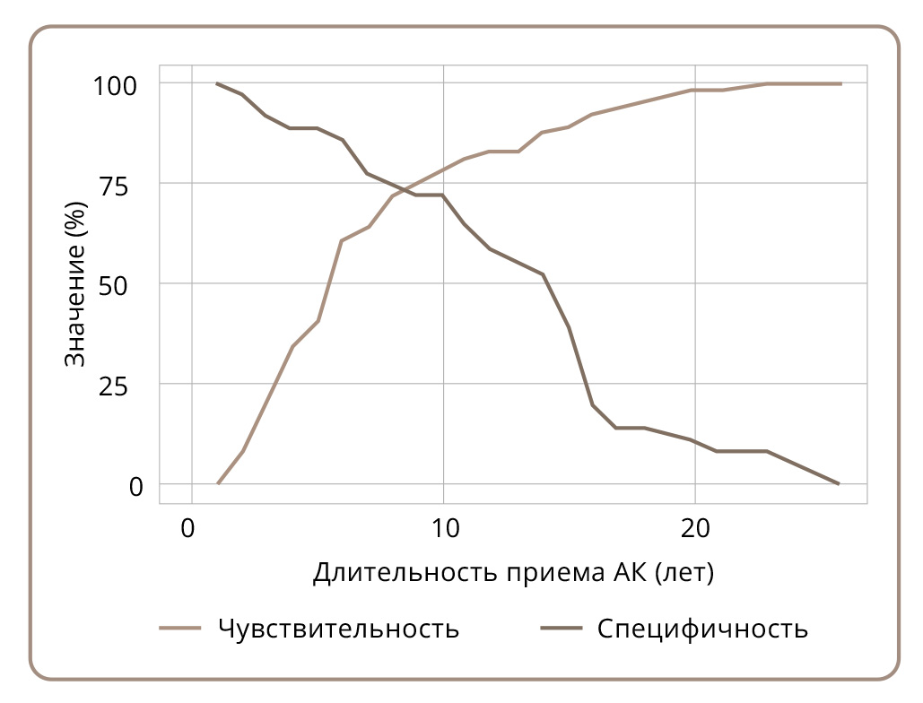 Рисунок 5. Анализ чувствительности и специфичности ROC-модели в зависимости от пороговых значений длительности приема антиконвульсантов (АК) в группе больных эпилепсией.