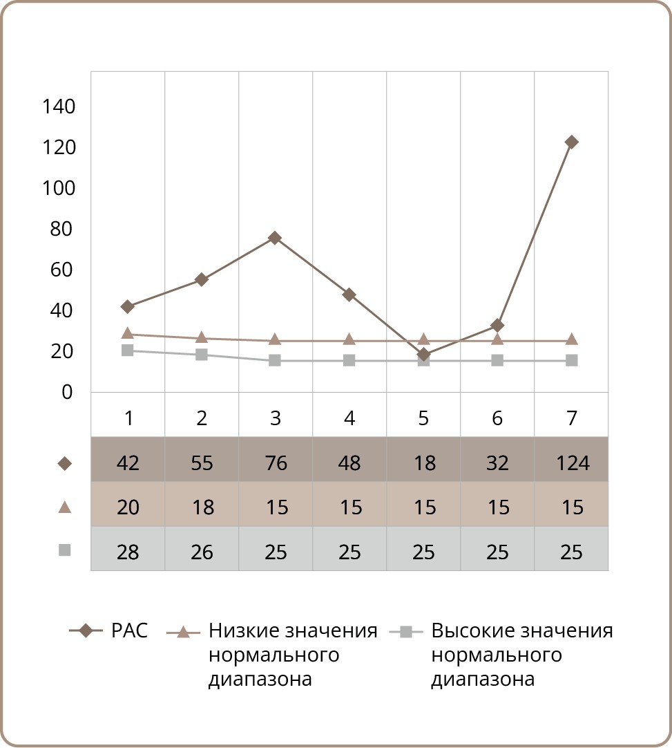 Для дальнейшего изучения этих различий каждая из 9 фигур Бендер-теста была проанализирована отдельно. Результаты показали, что по 7 из 9 фигур наблюдались статистически значимые групповые различия. Более высокие показатели зрительно- моторного функционировании были в группе детей с РАС (табл. 3). Этот анализ на уровне фигур подтверждает общую закономерность: хотя в обеих группах результаты ниже возрастной нормы, типы ошибок и вариабельность функционирования указывают на различия в механизмах когнитивной обработки. Рис. 1 и 2, а также табл. 2 наглядно демонстрируют выявленные закономерности в сравнении с возрастными нормативными диапазонами (например, 25–32 для 8-летнего возраста, 20–28 — для 9-летнего).