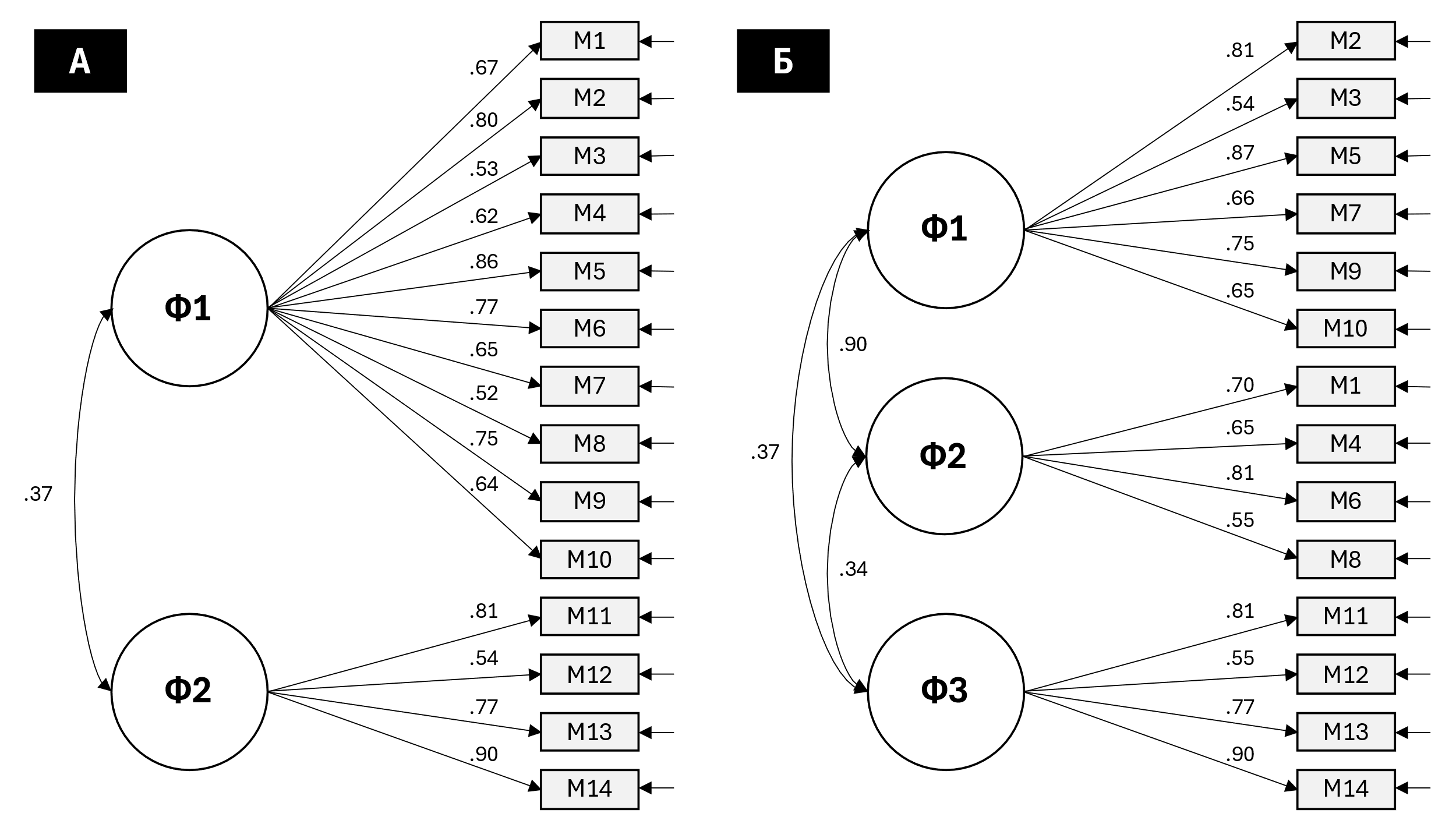 Рис. Конфирматорные факторные модели с двухфакторной (А) и трехфакторной (Б) структурами (N = 1392):