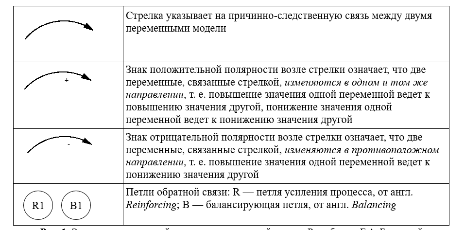 Рис. 1. Элементы качественной системно-динамической модели. Разработано Е.А. Бахановой (Битюцкая, Баханова, Корнеев, 2015, с. 48)