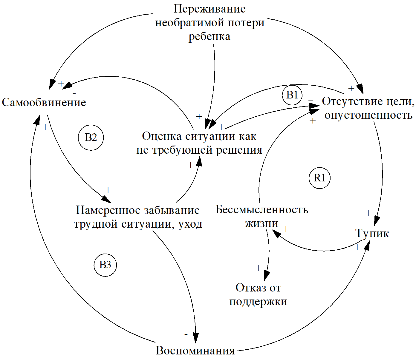 Благодаря экспертной оценке психолога, нам известно о том, что рассматриваемый случай характеризуется воспроизводящимся на протяжении двух с половиной лет циклом переживания потери. Поскольку ключевыми характеристиками цикла переживания являются обратная связь, повторяемость процесса, его усиление/ослабление, мы применили метод системной динамики, позволяющий моделировать циклические процессы (Битюцкая, 2022; Forrester, 1994). Для настоящего исследования этот метод оказался целесообразным, так как позволяет научно отрефлексировать сложные взаимосвязи компонентов воспринимаемой ситуации, проанализировать механизмы цикла и факторы его устойчивости. Полученная системно-динамическая качественная модель дает возможность выявить и визуализировать факторы: а) определяющие усиление процессов (они обозначаются в виде петель обратной связи R), б) создающие балансировку системы, ее устойчивость (балансирующие петли B) (рис. 1).