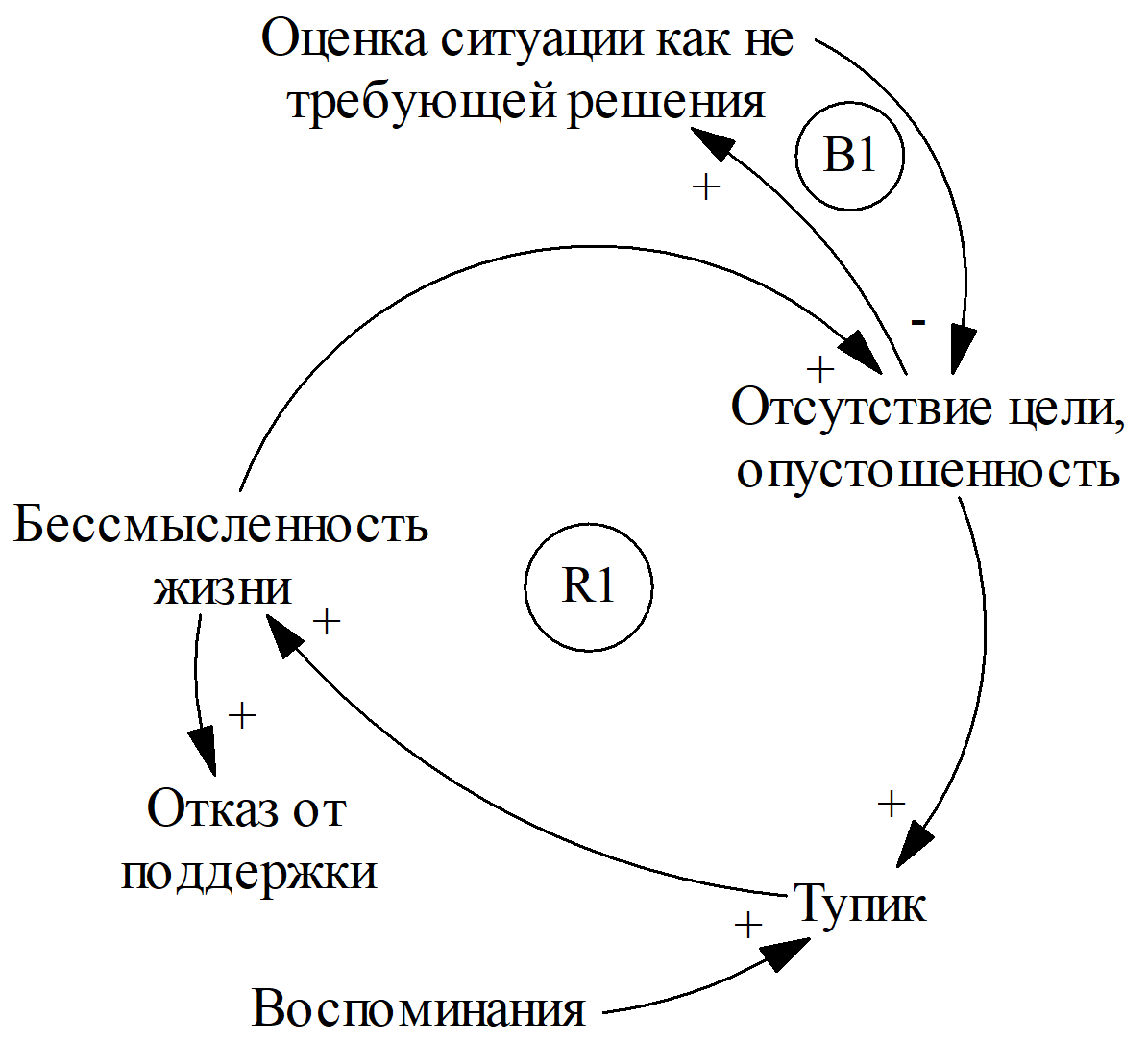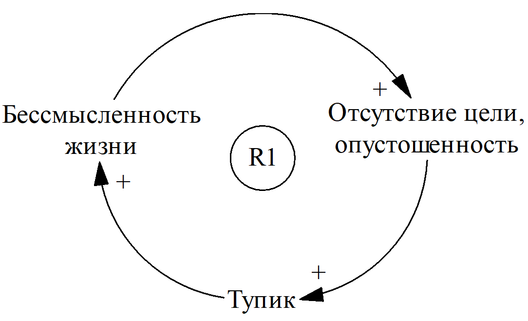 На рис. 3а изображена диаграмма (петля R1), которая показывает усиливающийся процесс. С усилением чувства опустошенности и отсутствия цели увеличивается субъективная безвыходность (чувство тупика), что далее повышает вероятность ощущения бессмысленности жизни.