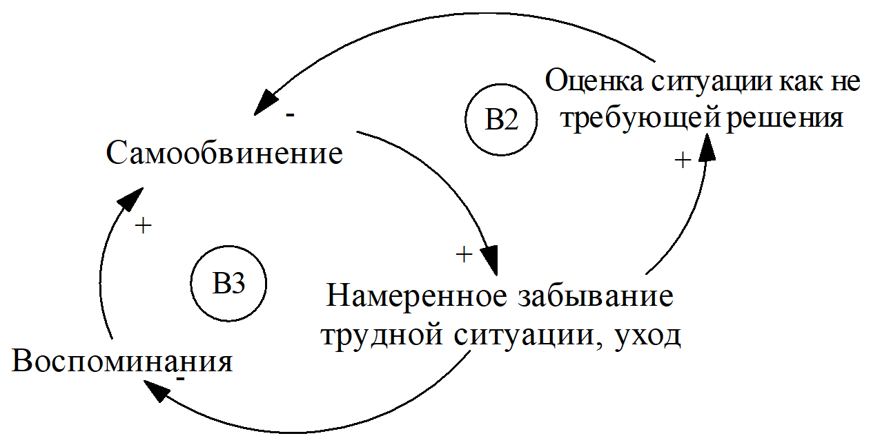 На рис. 4 показана петля обратной связи В2, которая моделирует балансирующий процесс: оценка ситуации как не требующей решения направлена на снижение самообвинения и связанного с ним намеренного забывания потери ребенка. Так же, как мы это рассмотрели для В1, на втором витке цикла самообвинение усилится, а на третьем снова уменьшится. Такие колебания, как ни парадоксально, создают условия устойчивости процесса. В свою очередь, намеренное забывание направлено на то, чтобы притупить воспоминания и связанное с ними самообвинение (В3).