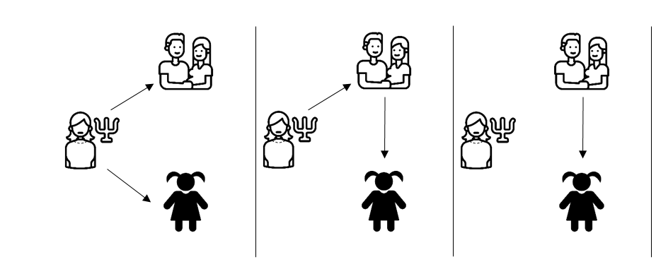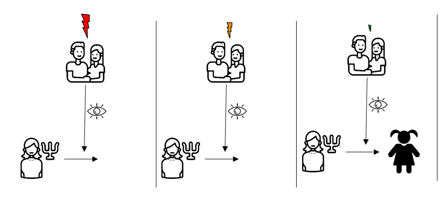 Существуют различные модели работы с семейной системой в рамках экспозиции. Модель терапии «Передача контроля» может быть использована для постепенной передачи знаний, навыков и методов от терапевта к родителю, а затем от родителя к ребенку (рис. 1). В начале лечения терапевт выступает в роли «тренера», как для родителей, так и для ребенка, а затем постепенно «передает» часть обязанностей тренера родителям, обучая их структурированным способам поддержки ребенка.