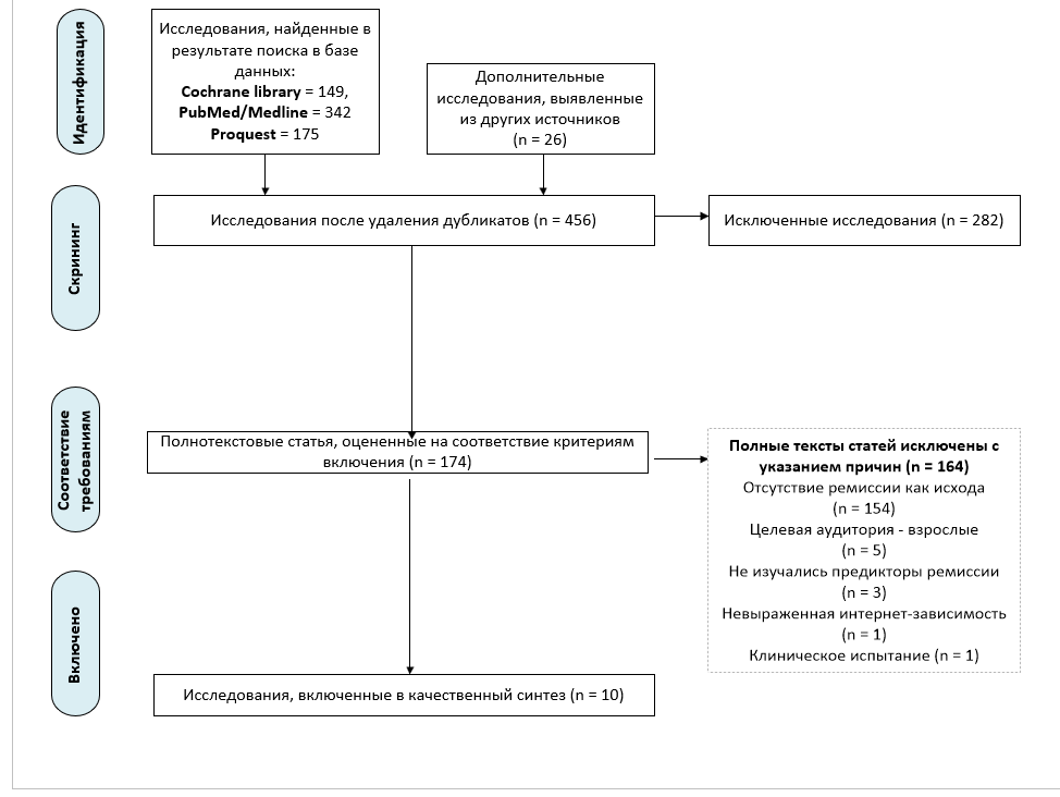 На рис. 1 приведена схема поиска литературы, проведенного 10 июля 2025 года, и включения исследований в обзор. В результате поиска по базам данных было выявлено 666 статей. При помощи метода «снежного кома» и анализа профильных журналов было добавлено еще 26 исследований. После удаления дубликатов в общей выборке осталось 456 исследований. По результатам оценки заголовков и аннотаций 282 статьи были исключены. Из 174 полнотекстовых статей 164 были исключены как несоответствующие критериям включения: в 154 исследованиях в качестве исхода не изучалась ремиссии, в 3 — не исследовались предикторы ремиссии, в 1 исследовании уровень интернет-зависимости не достигал тяжелой степени. в 1 исследовании в отношении детей применялось вмешательство. Разногласия между двумя рецензентами разрешались путем достижения консенсуса и, при необходимости, путем консультации с третьим исследователем.