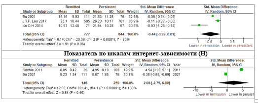 Низкий исходный балл по шкале CIAS (Lau et al., 2017) и низкий балл по шкале проблемной игровой зависимости (Gentile et al., 2011) ассоциировались с ремиссией. Bu et al. не выявили влияния исходного балла по шкале интернет-зависимости. Метанализ показал отсутствие статистически значимой связи между тяжестью исходной интернет-зависимости и вероятностью ремиссии (рис. 2, H).