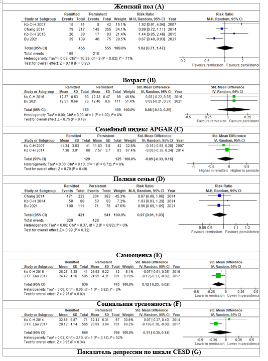 В настоящее время отсутствует единое мнение о влиянии депрессивных симптомов на вероятность ремиссии. Депрессивные симптомы, измеренные при помощи разных шкал (CESD (Lau et al., 2017), шкала депрессии для азиатских подростков (Gentile et al., 2011), CDI (Jeong et al., 2021), HADS (Marrero et al., 2021) и подшкала «позитивного аффекта» PANAS (Lau et al., 2017)), не влияют на вероятность ремиссии. Однако Ko et al. и Bu et al. показали, что более низкий балл по шкале CESD способствует ремиссии. Данные о тяжести депрессии по шкале CESD были включены в метаанализ (рис. 2, F). Влияние показателей депрессии по шкале CESD на вероятность ремиссии не достигло статистической значимости, однако была обнаружена выраженная тенденция к этому. Вероятность ремиссии не зависит от наличия депрессии (Chang et al., 2014). Однако отсутствие выраженной депрессии, диагностируемой по шкале CESD, является предиктором ремиссии (OR = 0,72) (Lau et al., 2017).