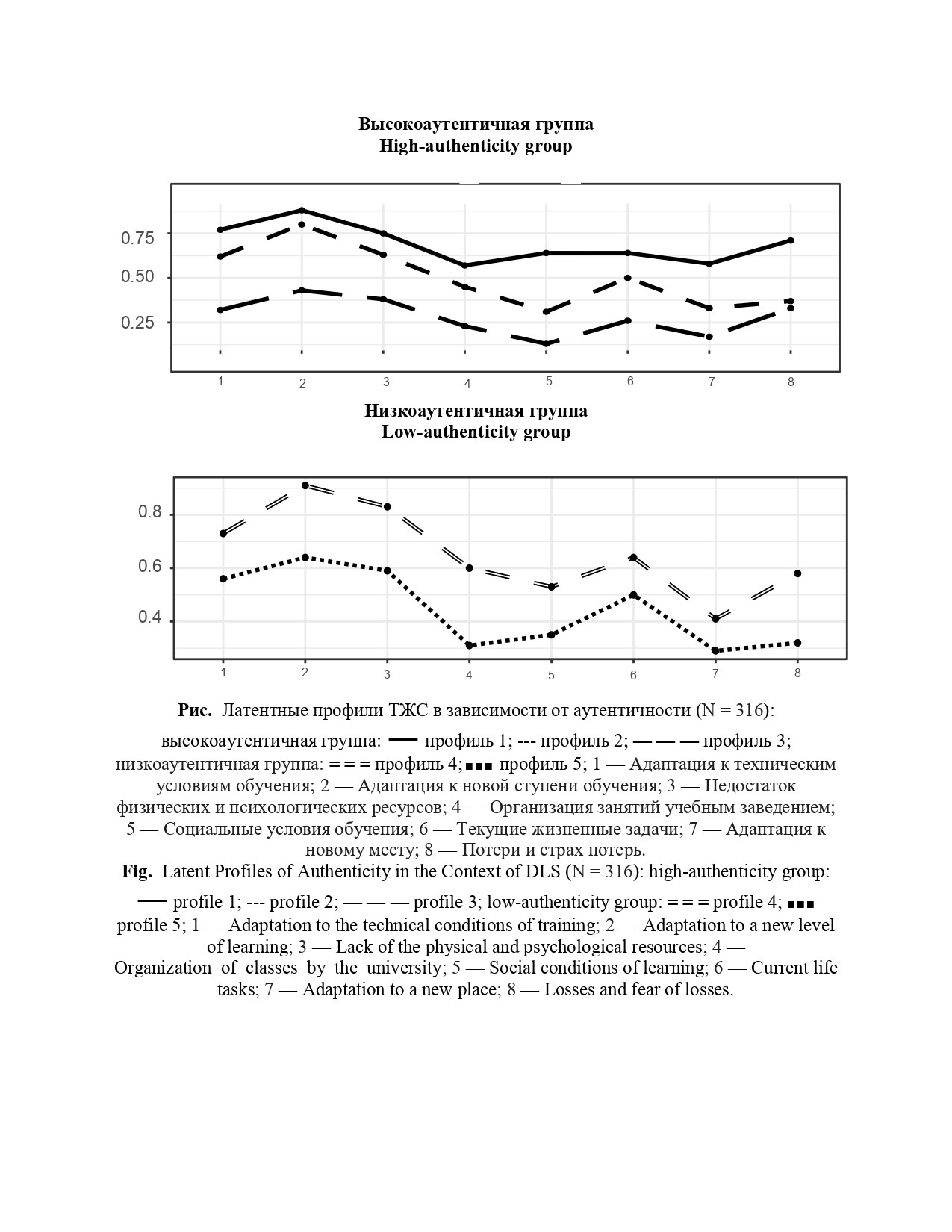 Группа высокоаутентичных респондентов (N = 156) оказалась более вариативной с точки зрения воспринимаемых ТЖС; в ней было выделено три дифференцированных профиля (BIC = -192.41), в то время как в группе низкоаутентичных (N = 160) — всего два (BIC = -115.95). Как и ожидалось, аутентичность не связана с восприимчивостью к ТЖС однозначно: в обеих группах выделяются как сильно сензитивные, так и вполне резистентные к трудностям респонденты. Во всех пяти идентифицированных при помощи анализа латентных профилей типах ведущий пик представлен выраженностью затрудненной адаптации к новой ступени обучения, что вполне отвечает основной задаче развития первокурсников. Что же касается снижений профиля, отражающих резистентность к трудностям, то именно они в основном и различают выделенные типы. Остановимся кратко на содержании выделенных типов.