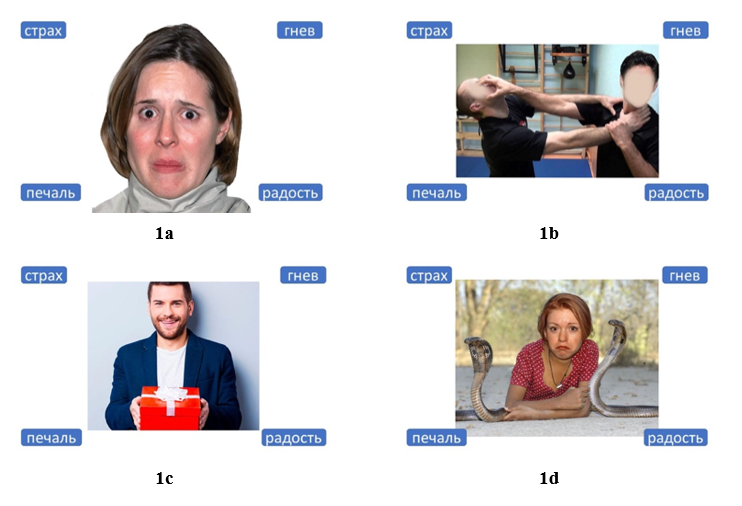 - Ситуации, в которых лицевая экспрессия соответствует ситуации переживания, 48 стимулов (см. рис. 1c), (инструкция 1 и 2);