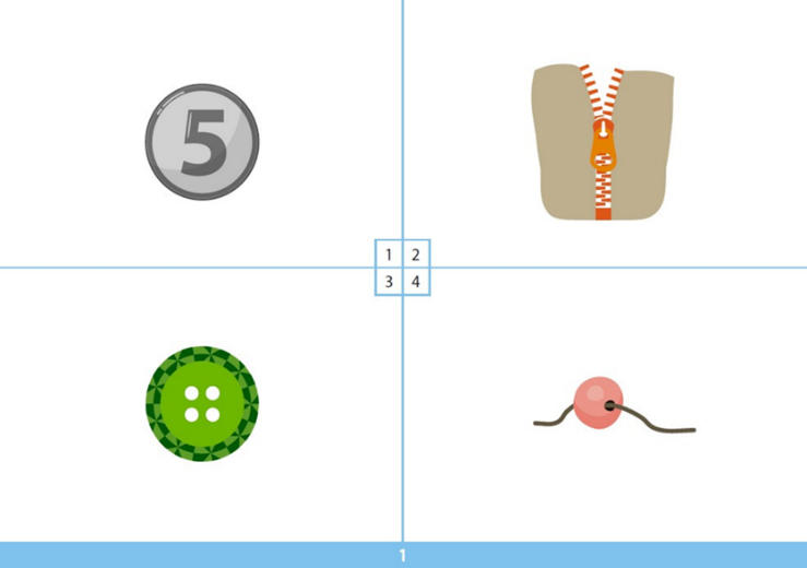 Перед ребенком открывается первая, тренировочная страница теста (рис. 1) и предлагается инструкция: «Сейчас я покажу тебе картинки и буду называть слово. Тебе нужно показать на ту картинку, которая обозначает это слово. Давай потренируемся. Покажи, где здесь пуговица?». Если ребенок показывает правильно, звучит продолжение: «Молодец, отлично. Давай продолжим». Если ребенок показывает что-то другое, ему еще раз говорят: «Посмотри внимательно, нам нужна не бусина, не монетка и не молния, а именно пуговица. Покажи, где она». После этого вводного задания начинается собственно тестирование.