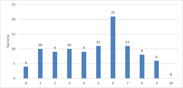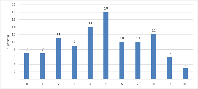 Согласно результатам прохождения Опросника на скрининг ПТСР 46,7% респондентов г. Мариуполя (n = 42) получили 6 и более баллов, что позволяет отнести их к группе риска ПТСР. При этом осуществленная нами количественная обработка материалов исследования показывает, что распределение данных по результатам опросника на скрининг ПТСР (рис. 1) отличается от нормального (W = 0,95, p = 0,009).