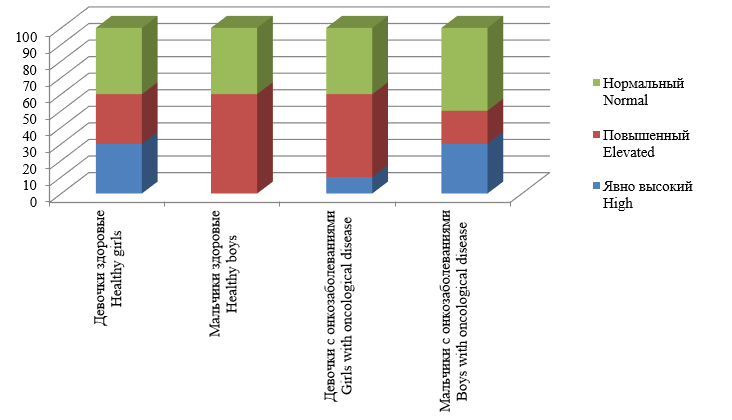 На рисунке 1 видно, что высокий уровень тревожности преобладает у девочек группы сравнительного анализа, в то время как девочки с онкологическими заболеваниями проявляют высокую тревожность в меньшей степени. В группе мальчиков картина выглядит несколько иначе: у мальчиков без хронических заболеваний не отмечается высокого уровня тревожности, а у мальчиков с онкопатологией высокий уровень тревожности составляет 30%.