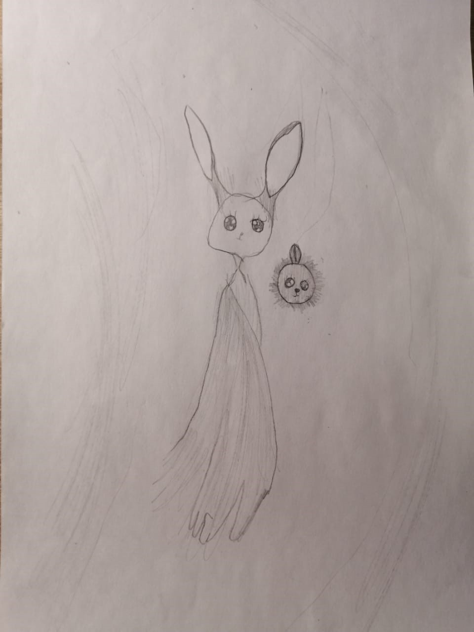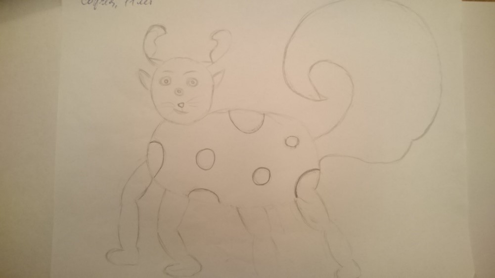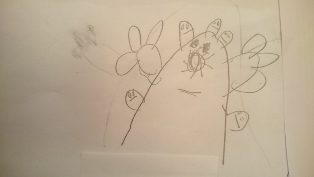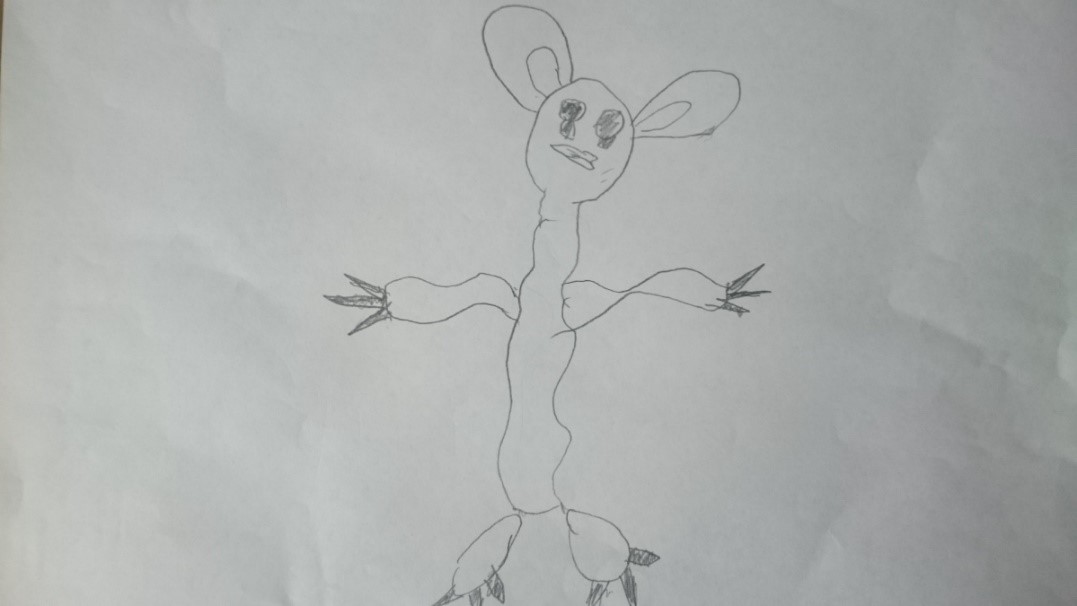 Это несуществующее взрослое животное (рис. 5) живет в волшебном мире с семьей и друзьями и питается цветами. Любит прятаться от людей. У него есть враг — коронавирус. У этого животного есть три желания: чтобы коронавирус закончился, чтобы семья жила долго, и чтобы Земля была здоровой. Рисунок был выполнен весной 2022 года, и несмотря на то, что пандемия коронавирусной инфекции к этому времени завершилась, ребенок проявляет страх перед заболеванием. Штриховка на рисунке может свидетельствовать о наличии повышенного уровня тревожности. Зачерненные глаза в рисунке свидетельствуют о наличии страха. Рядом с животным летает ежик, который защищает его. Возможно, у ребенка отмечается страх перед агрессией.