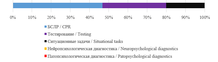 Основные выводы нашего исследования касаются трудностей, которые аккредитуемые специалисты отмечают в процессе аккредитации. Среди самых сложных этапов большинство респондентов выделили тестирование, особенно вопросы, связанные с нейропсихологическим направлением, а также станцию по базовой сердечно-легочной реанимации (рис. 3). Прохождение этапов нейро- и патопсихологической диагностики не вызвали затруднений у опрошенных.