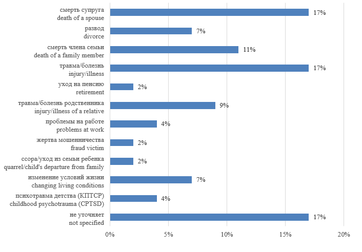 Limitations. It is important to note that the data obtained are preliminary, since not all patients at the initial consultation with a psychologist were ready to voice the details of the traumatic experience. Further research is needed to clarify the period and type of the traumatic event, as well as to identify emotional and personal characteristics that affect the characteristics of living after a traumatic experience.