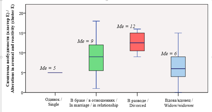 Пост-хок тест Данна показал, что пациенты в разводе имеют более выраженные симптомы возбудимости по сравнению с состоящими в браке (p = 0,008) и овдовевшими (p = 0,002), что проявляется раздражительностью, импульсивным поведением и нарушениями сна (рис 2).