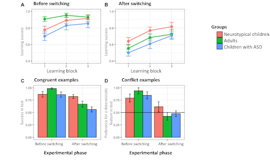 Также можно предположить, что детям с РАС трудно самим менять задачу, принять, что прежняя стратегия неэффективна, и самостоятельно организовать поиск. На первой фазе эксперимента задача научения слегка отличалась по формату ― обратная связь была более подробной, чем на второй фазе. Тот факт, что дети с РАС после переключения в тесте имели успешность ниже, чем на первой фазе научения, говорит, возможно, о том, что они, кроме научения правилу, имеют еще и привыкание к формату выполнения задания.