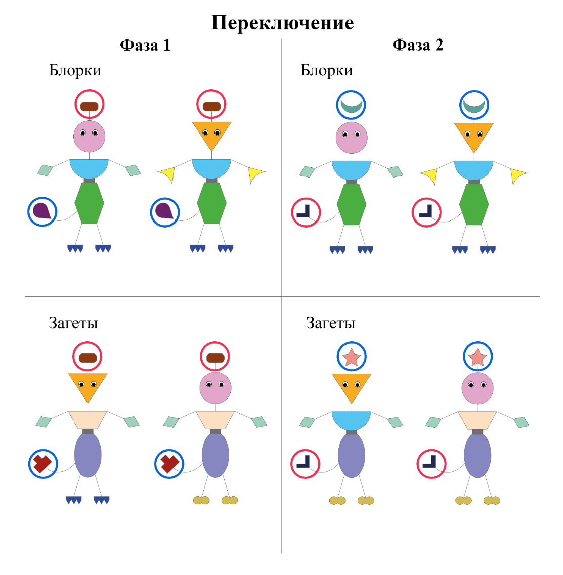 Задачей участников было формирование двух категорий искусственных существ (для детей задача формулировалась как «Вам покажут существ с разных планет. Их зовут Блорки и Загеты. Существа с одной планеты чаще всего похожи друг на друга и имеют похожие [перечисление вероятностных признаков]. Существа с одной планеты всегда имеют одинаковый [детерминирующий признак]. Вам нужно научиться различать Блорков и Загетов»). В качестве примеров категории были модифицированные изображения, использованные в исследованиях С. Денг и В. Слуцкого (Deng, Sloutsky, 2015a,b, 2016). Каждый пример категории состоял из семи признаков, каждый признак мог иметь два значения. Один из признаков выступал в роли диагностического, так как одно его значение (например, цвет и форма хвоста) присутствовало у 100% примеров одной категории, тогда как противоположное значение (другой цвет и форма) встречалось у 100% примеров другой категории. Также имелся нерелевантный признак, который имел одинаковое значение для всех примеров обеих категорий. Пять других признаков были вероятностными, поскольку определенные значения наблюдались у 75% примеров одной категории, а у 25% — противоположные значения. На первом этапе эксперимента было представлено 10 примеров, по 5 для каждой категории. В зависимости от фазы эксперимента различались диагностические признаки, определяющие категории, и нерелевантные признаки, не влияющие на процесс категоризации. Например, в первой фазе диагностическим признаком выступал хвост, тогда как антенна считалась нерелевантным признаком. Во второй фазе их роли менялись (рис. 1). Вероятностные признаки оставались неизменными: голова, грудь, руки, туловище, ноги.