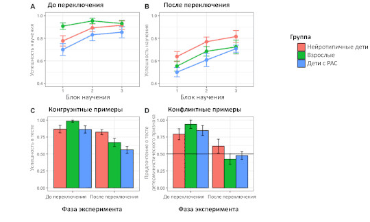 Показательно, что все группы (и дети с РАС, и нейротипичные дети, и нейротипичные взрослые) показали снижение успешности научения после смены категориального признака. Более того, снижение успешности сохранялось даже к завершению обучения, при этом наиболее заметным оно было у группы детей с РАС (Рис. 2В). У детей с РАС уровень успешности научения в первом блоке после переключения снизился до уровня случайных ответов (0,5), что указывает на выраженность эффекта выученного невнимания у этой группы.