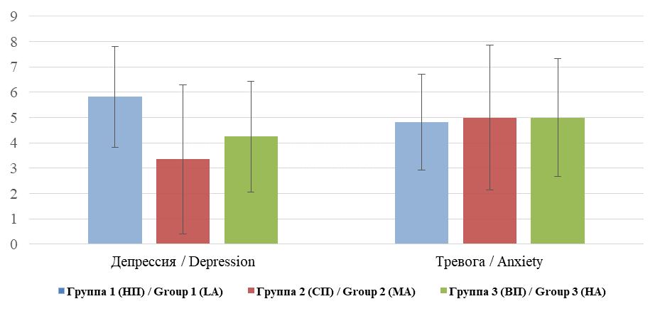 Статистический анализ значимости межгрупповых различий показал, что выделенные нами группы пациентов значимо различаются по выраженности симптомов депрессии (H = 7,498, p = 0,024), измеренных Госпитальной шкалой тревоги и депрессии (HADS) (рис. 1). В группе пациентов с низкой приверженностью наблюдается наибольшая выраженность симптомов депрессии, что в некоторой степени может обуславливать низкую вовлеченность таких пациентов в процесс лечения. Уровень тревоги, выявляемый Госпитальной шкалой тревоги и депрессии, значимо не различается между группами пациентов с разным уровнем приверженности (рис. 1).