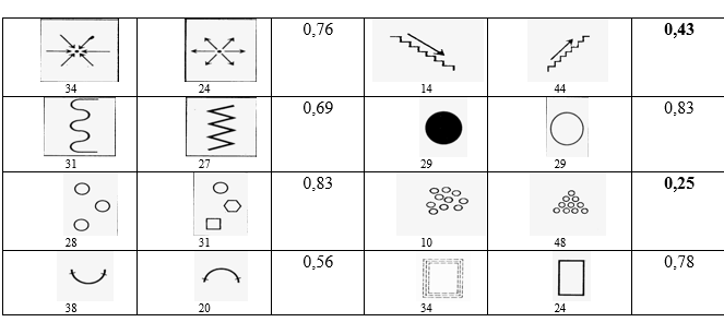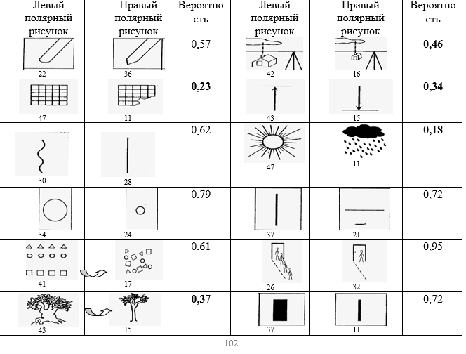 Поэтому задачей нашего исследования являлось, с одной стороны, построение инструмента оценки значимости объекта диагностики путем создания полярных образных (графических) оппозиций для семантического дифференциала. И, с другой стороны, сопоставление оценки эмоциональной значимости символических объектов, соответствующих стимульным вербальным понятиям.
