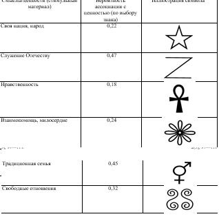 Результаты экспертизы ассоциативных соотношений вербального обозначения и символического (знакового) представления смыслов-ценностей