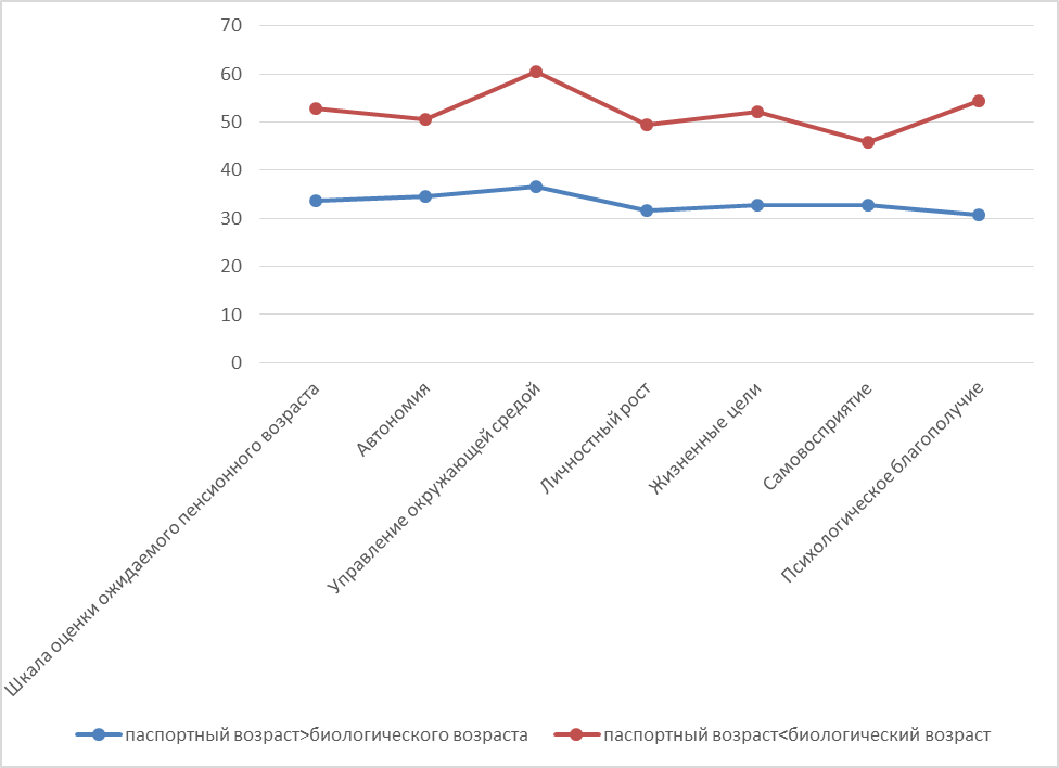 В исследовании, как было указано выше, приняли участие 32 человека — учителя городских и региональных школ в возрасте от 24 до 63 лет. По результатам предварительного тестирования выборка была разделена на две группы: 1) 12 человек, которые считали, что их психологический возраст (самооценка по методике К.А. Абулхановой и Т.Н. Березиной) ниже биологического возраста (паспортного возраста); 2) 20 человек, чей психологический возраст оказался выше биологического возраста.