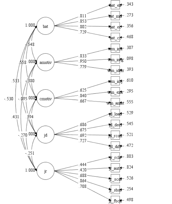 Рис. Структурная модель связи выгорания (bat), автономной мотивации (amotiv), контролируемой мотивации (cmotiv), требований (jd) и ресурсов работы (jr)