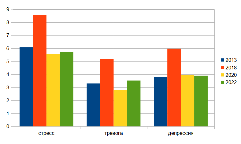 Приведенные А.А. Золотаревой в качестве неких ориентиров результаты популяционных исследований также показывают, что в среднем для респондентов, сопоставимых с нашей выборкой по возрасту и социальному статусу, показатели стресса располагаются в диапазоне от 3,2 до 5,2, тревоги — от 3,2 до 4,7 и депрессии — от 4,3 до 4,8 (Золотарева, 2020). Эти показатели получены в период с 1998 по 2018 год, т. е. в них не учтены колебания измеряемых нами параметров в связи с экстраординарными событиями периода пандемии COVID-19. В более поздней публикации тот же автор приводит несколько иные показатели для российской выборки с более широким диапазоном нормативных значений, а именно: по шкале стресса — от 1,08 до 9,34, тревоги — от 0 до 6,72, депрессии — от 0 до 6,09 (Золотарева, 2021).