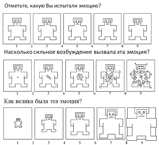 Fig. 2. Testing the emotional state according to the indicators of valence, arousal and amplitude of the reaction using the Self-Assessment Manikin method