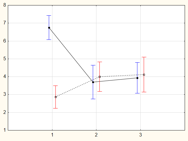 Рис. 3. Оценка эмоциональной реакции, согласно SAM, после просмотра фильма, содержание которого составляют природные явления (сплошная линия), и фильма, содержание которого составляют техногенные явления (пунктир). По оси Х показатели валентности (1), возбуждения (2) и амплитуды (3) эмоции