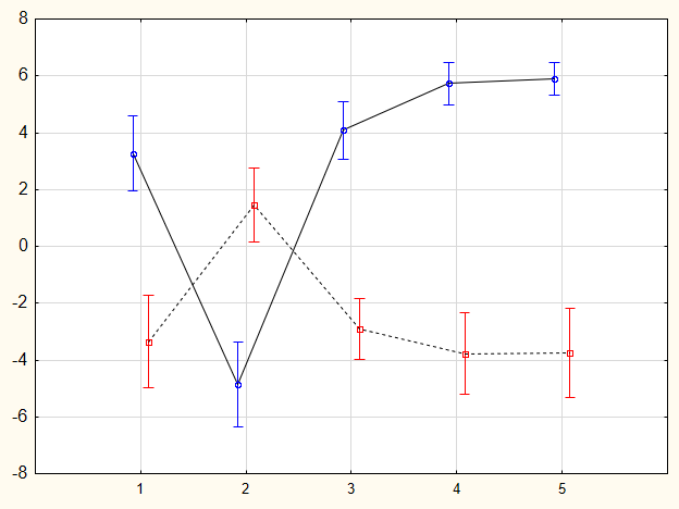 Fig. 4. Evaluation of emotional reactions according to the questionnaire results after watching a film, the content of which consists of natural phenomena (solid line), and a film, the content of which consists of man-made phenomena (dashed line). On the X-axis are the indicators «Joy—sadness» (1), «Activation—relaxation» (2), «Approach—avoidance» (3), «Pleasant—disgusting» (4) and «Beautiful—ugly» (5)