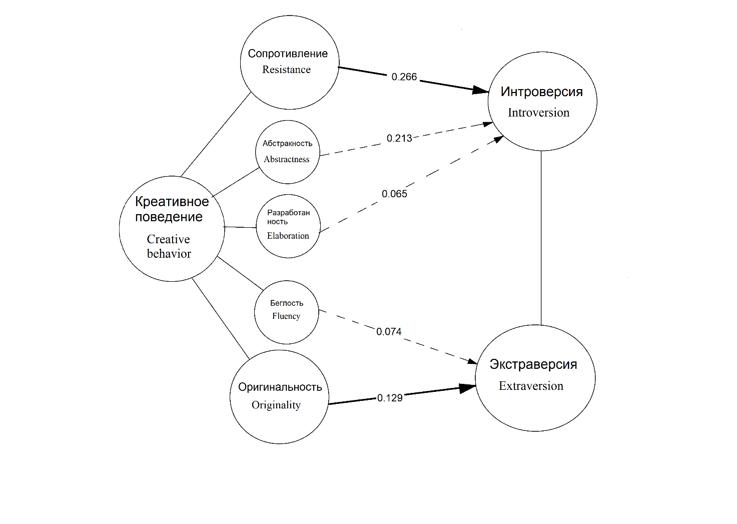 Рис. Влияние параметров креативного поведения на интроверсию-экстраверсию: → — параметры, включенные в модель; ⇢ — параметры, исключенные из модели; N = 110; α = 0,05
