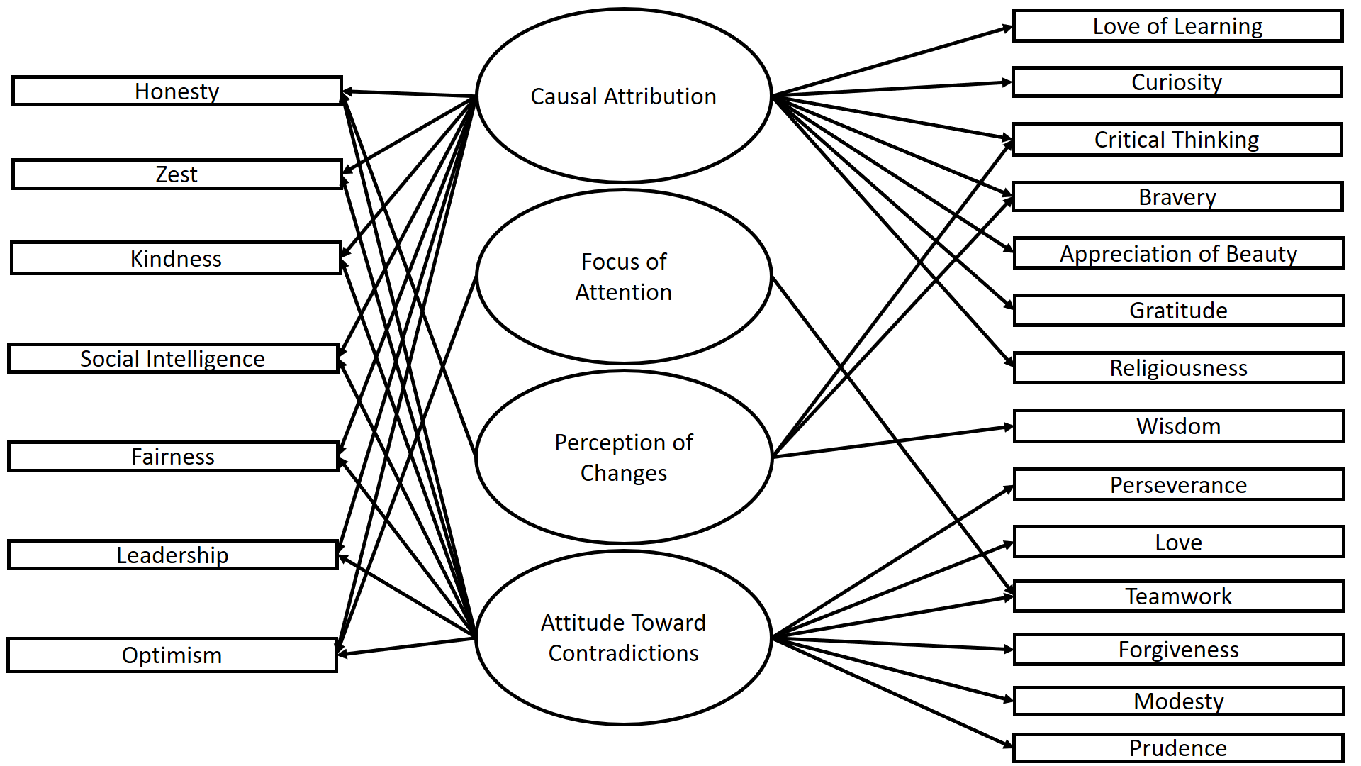 Холистический полюс каузальной атрибуции связан с сильными сторонами личности «любовь к учению» (p < 0,05), «любопытство» (p < 0,01), «критическое мышление» (p < 0,05), «храбрость» (p < 0,05), «честность» (p < 0,01), «энергичность» (p < 0,01), «доброта» (p < 0,01), «социальный интеллект» (p < 0,05), «беспристрастность» (p < 0,05), «лидерство» (p < 0,05), «умение ценить красоту и совершенство во всем» (p < 0,05), «благодарность» (p < 0,01), «оптимизм» (p < 0,01) и «духовность» (p < 0,01).